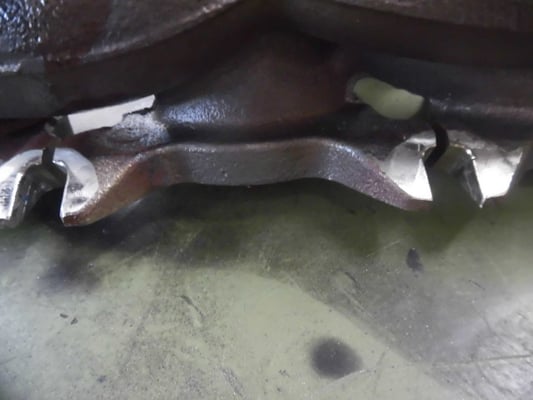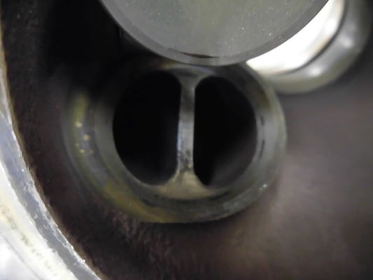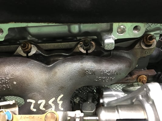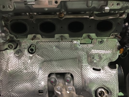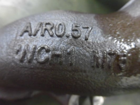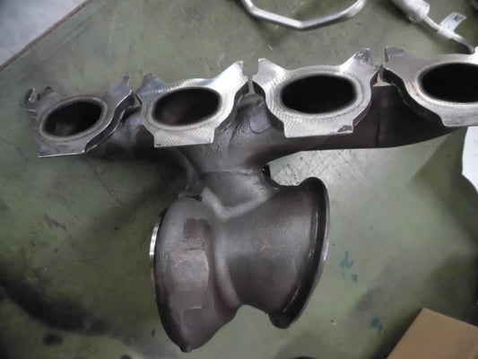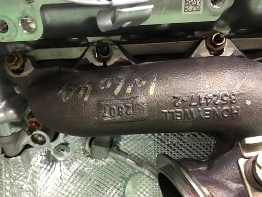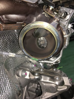 ・エキマニ一体式タービンハウジングはシリンダーヘッド側から4気筒の排気ポートがあり、等長ではないが#1と#4、#2と#3がそれぞれ集合してツインスクロールとしてタービンハウジングに続いている。刻印からA/R0.57と読み取れる。